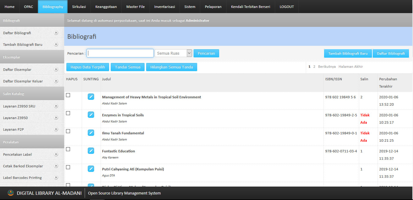 HomePerpustakaan Perpustakaan Perpustakaan Perguruan Tinggi Al-Madani dilengkapi dengan koleksi paper book, e-book, jurnal, e-journal terkini. Perpustakaan ini juga menggunakan software perpustakaan untuk memudahkan pengguna. Digital library UAM